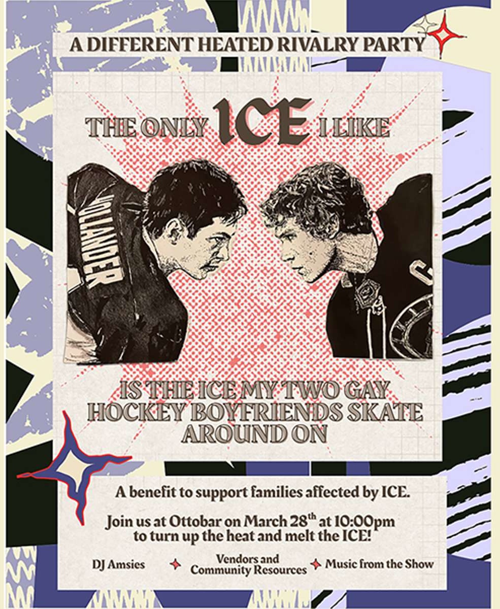Heated Rivalry returns to Ottobar on March 28 at 10 PM after a sold-out party in February. This edition is a benefit for families affected by ICE, bringing the community together for a night of dancing, music from DJ Amies, and local vendors. Come bring the heat and support a good cause.