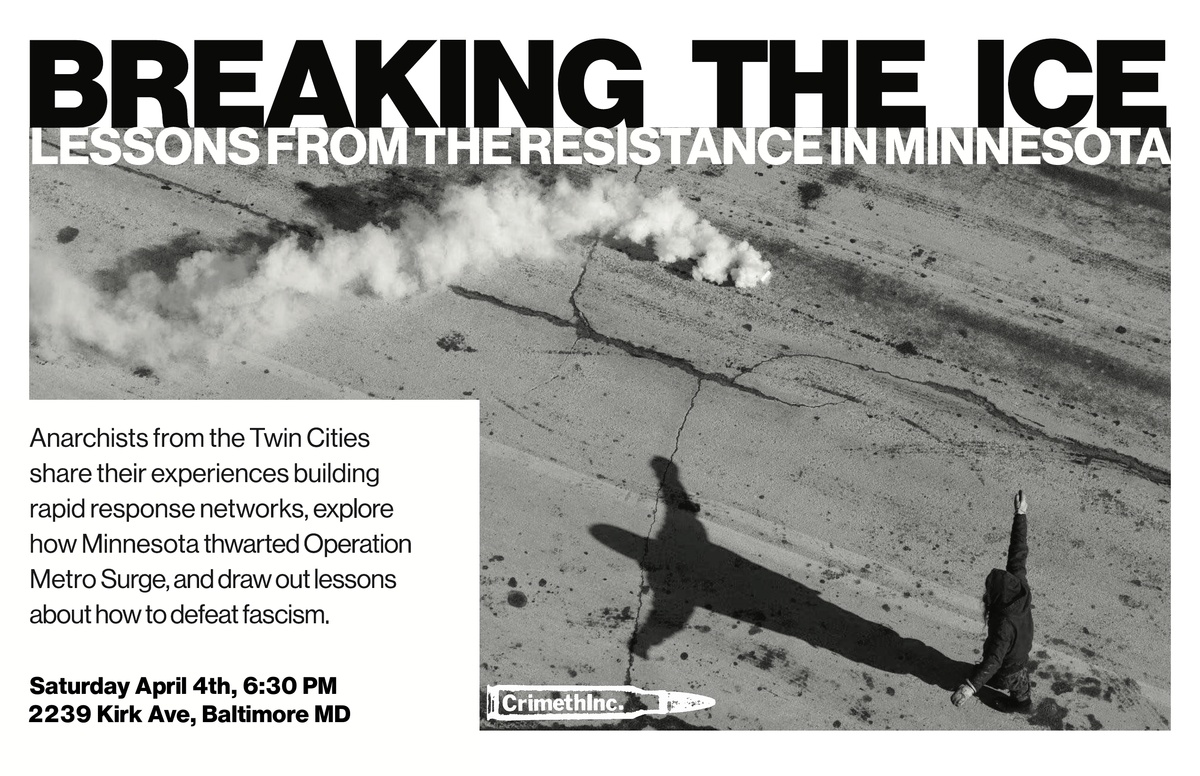 In April, anarchists from the Twin Cities who have participated in resisting the ICE occupation there will travel the country speaking on their experiences. At each presentation, they will share what they have learned from building rapid response networks, explore how Minnesota thwarted Operation Metro Surge, and draw out lessons about how to defeat fascism. On April 4th at 6:30 PM they will be speaking at The Compound in Baltimore.