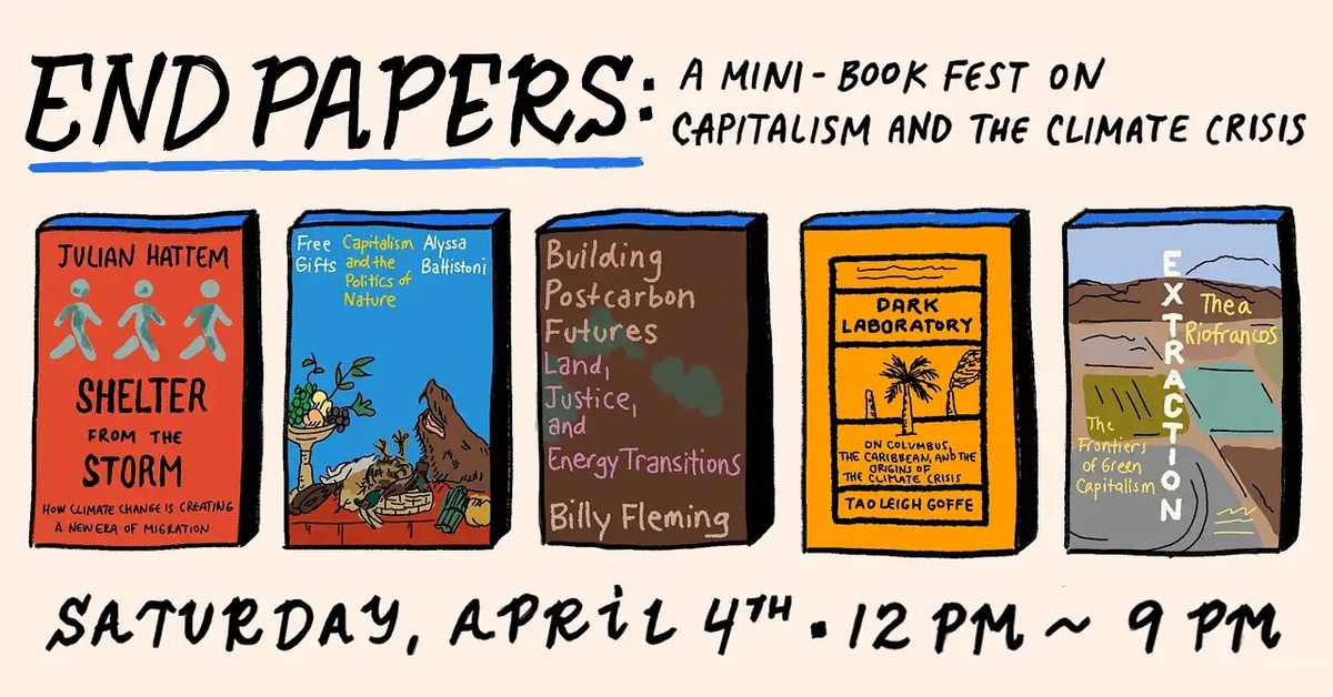 A one-day festival of books on capitalism and the climate crisis, featuring Thea Riofrancos, Tao Leigh Goffe, Alyssa Battistoni, Billy Fleming, Julian Hattem and more! Plus a radical resource fair with local climate organizers! Noon - 9pm. FREE!